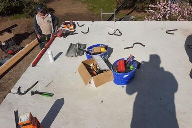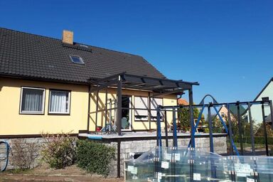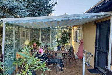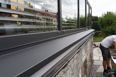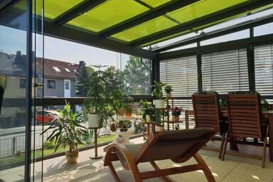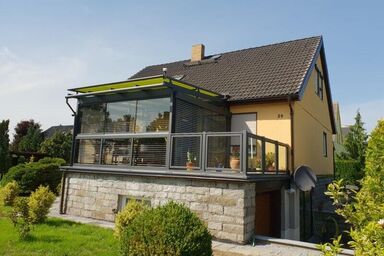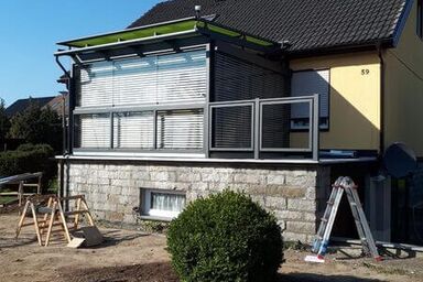 Herstellung und Montage eines Sommergartens auf der Garage. Mit der passenden Aufdach-Markise und den Raffstoren ist ein optimaler Sonnenschutz gegeben. Neben den Glasschiebeelementen haben wir ein Geländer als Absturzsicherung aus Edelstahl angebracht.