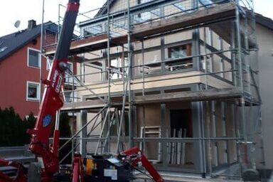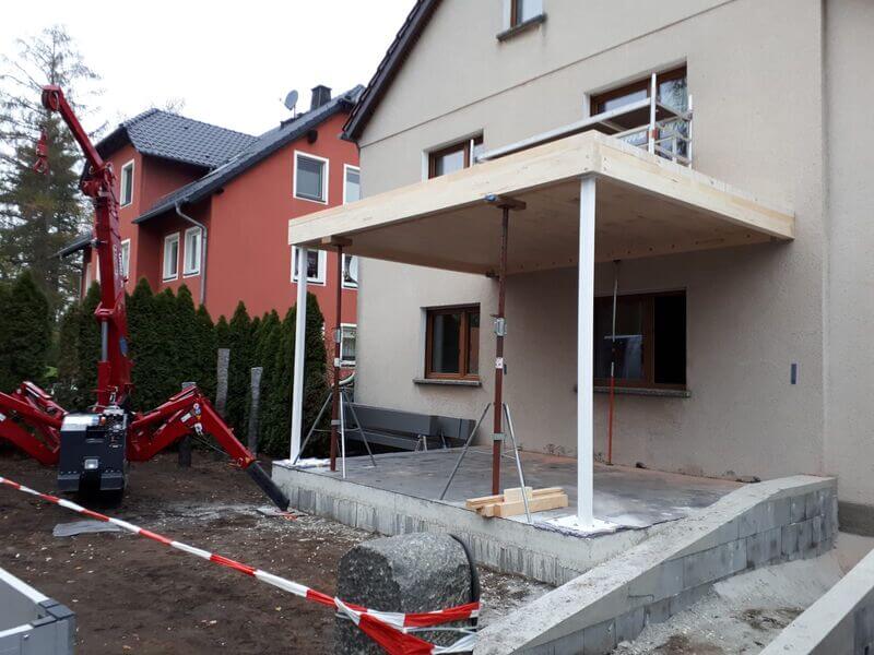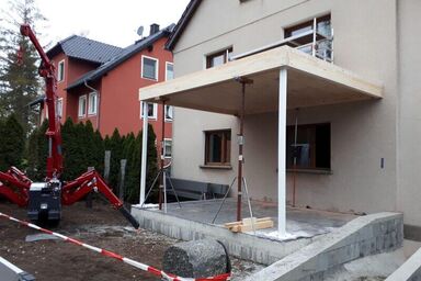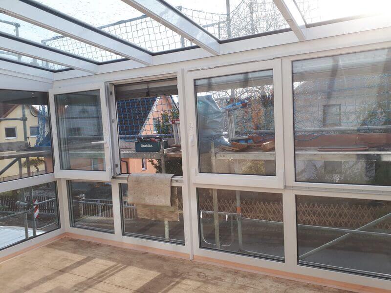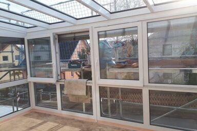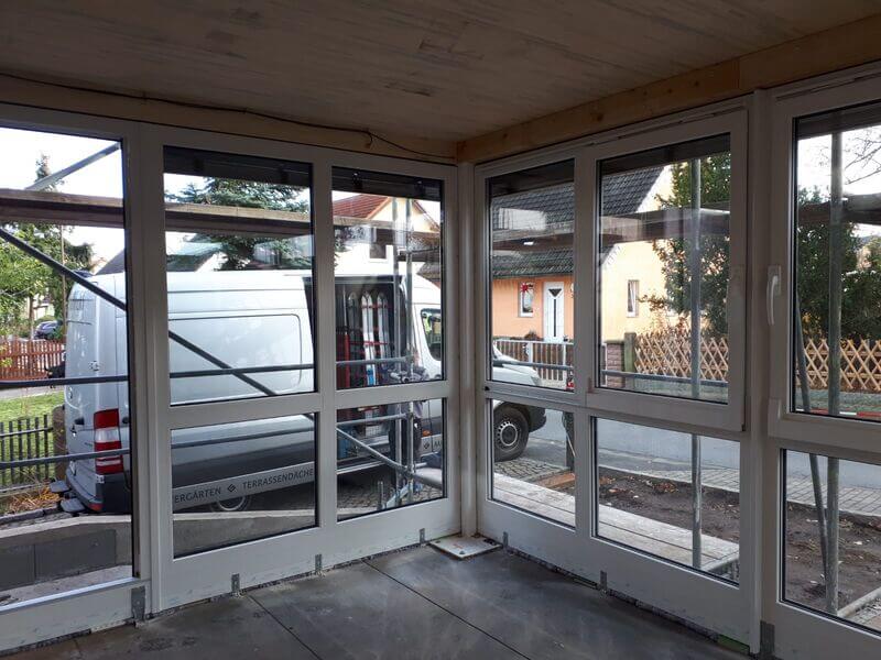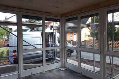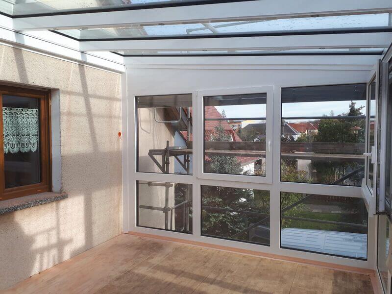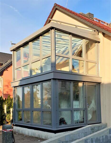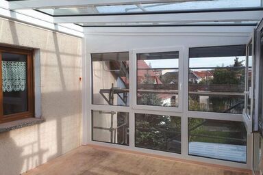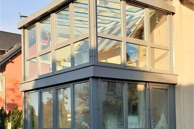 Herstellung und Montage eines doppelstöckigen Wintergartens in Königsbrück. Mit der passenden Aufdach-Markise und den Raffstoren wird ein optimaler Sonnenschutz garantiert. Zwischen beiden Anlagen befindet sich eine 160mm Holzstapeldecke.