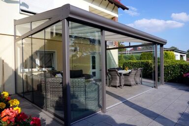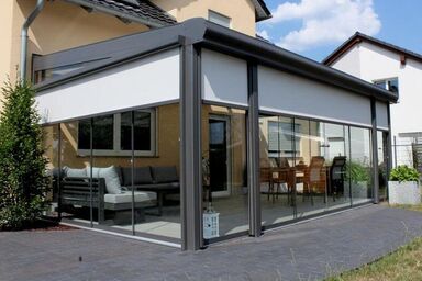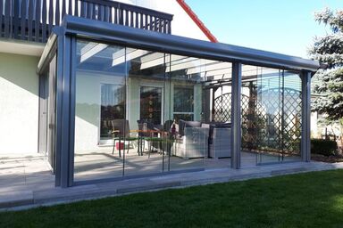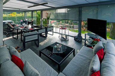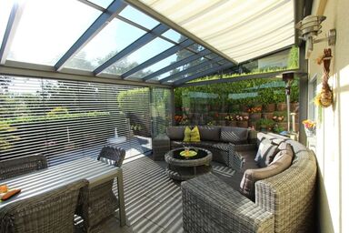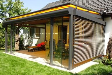 Diafano Eleganza ist das Dachsystem für anspruchsvolle Individualisten. Verschiedene, individuell an die Traversen anhängbare Traufenprofile in gerader oder geschwungener Optik bieten zahlreiche Gestaltungsmöglichkeiten. Besondere Akzente setzen Sie mit der beleuchteten Rinne, sowie mit dem integrierten vertikalen Beschattungssystem. Hier verschwindet besonders elegant der Sonnenschutz komplett in der Traufe hinter dem Rinnenprofil.