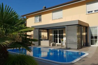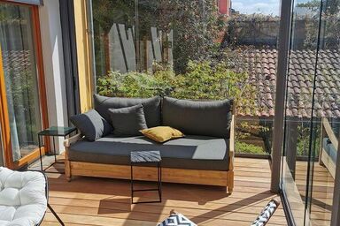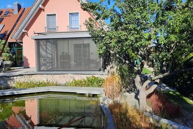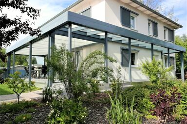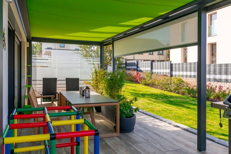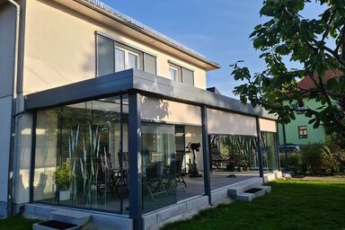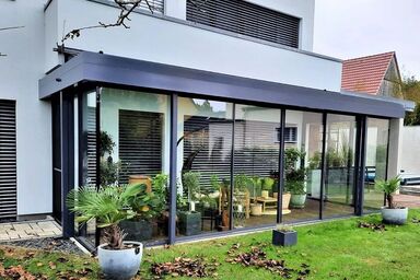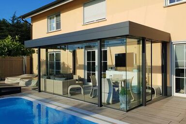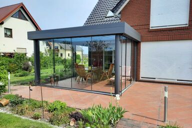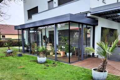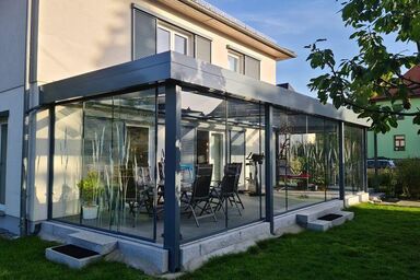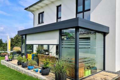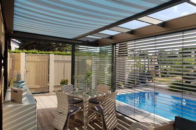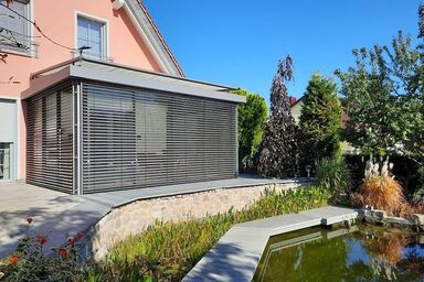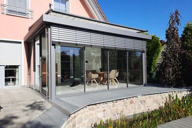 Die puristisch-geradlinige Optik der Lounge ist Ausdruck eines neuen Lebensgefühls. Die umlaufend gerade Blende verbürgt nicht nur das minimal geneigte Glasdach, sondern auch die horizontale Beschattung. Verschiebbare Glasfronten bieten einen hervorragenden Schutz bei jedem Wetter.