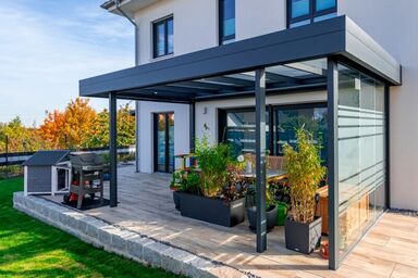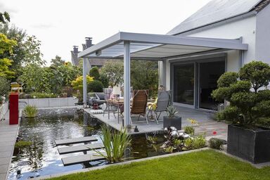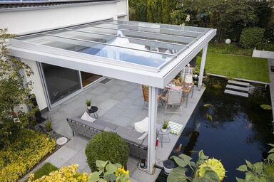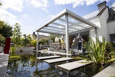 Die puristisch-geradlinige Optik der Lounge ist Ausdruck eines neuen Lebensgefühls. Die umlaufend gerade Blende verbürgt nicht nur das minimal geneigte Glasdach, sondern auch die horizontale Beschattung. Verschiebbare Glasfronten bieten einen hervorragenden Schutz bei jedem Wetter.